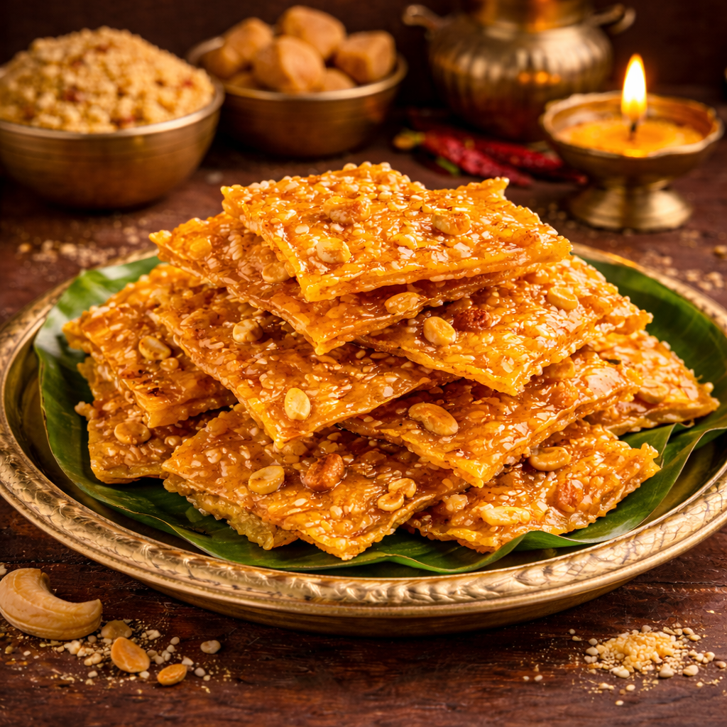 Boondhi Patti is a beloved South Indian snack made from premium chickpea flour (besan) and carefully fried into golden, crispy sheets. Lightly sweetened with jaggery or sugar, this snack offers the perfect balance of crunch and flavor in every bite.