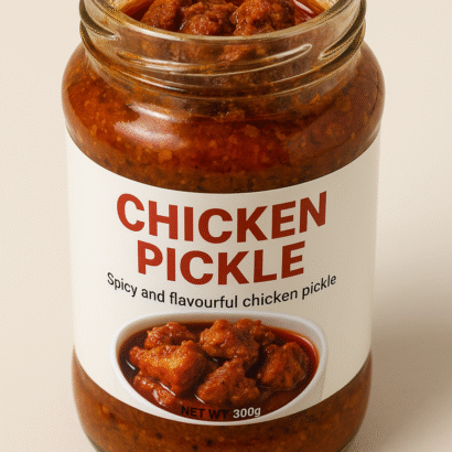 Experience the bold and fiery taste of our Traditional Chicken Pickle, crafted from succulent boneless chicken pieces marinated with freshly ground spices and slow-cooked in pure oil for hours to achieve the perfect balance of spice, tang, and aroma. This South Indian specialty is rich, flavorful, and protein-packed — ideal to pair with rice, rotis, or even as a snack on its own. Free from artificial preservatives and colors, this pickle delivers pure homemade taste with every bite.