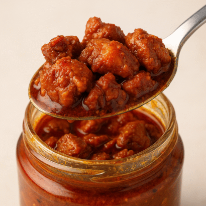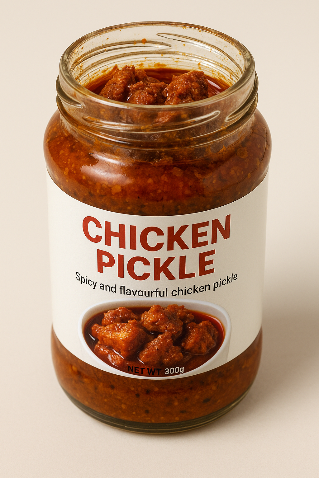 Authentic Indian-style Chicken Pickle made with tender chicken chunks, hand-roasted spices, and pure edible oil — a spicy, tangy delicacy loved across India.