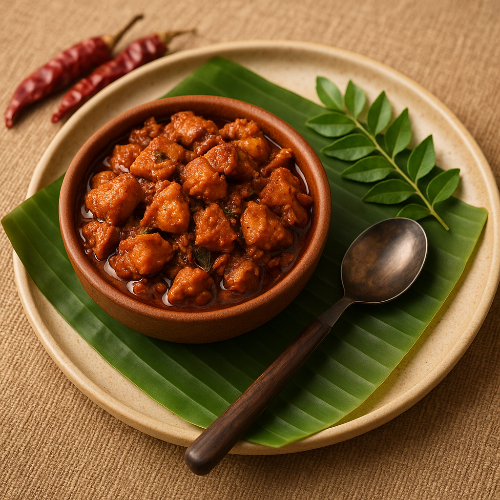 Ingredients: Boneless Chicken, Edible Oil, Red Chilli Powder, Mustard Seeds, Ginger-Garlic Paste, Salt, Turmeric, Fenugreek, Curry Leaves.