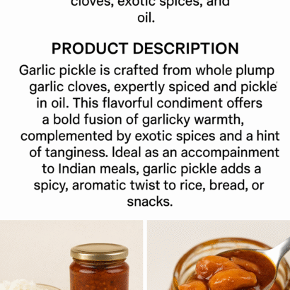 Experience the rich, spicy delight of Traditional Indian Garlic Pickle, crafted with plump garlic cloves slow-cooked in tangy oil and a blend of traditional spices. Known for its strong flavor and health benefits, this pickle is a must-have for spice lovers. It pairs wonderfully with rice, rotis, parathas, and curd rice. Made using age-old home-style recipes, our Garlic Pickle is completely free from artificial colors or preservatives, offering pure, authentic taste in every bite.