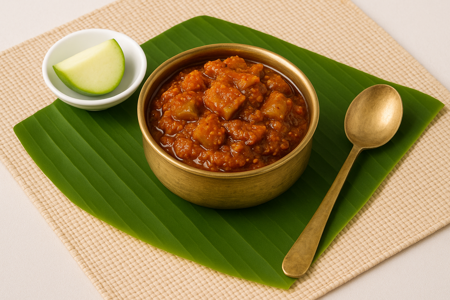 Traditional Indian-style Mango Pickle made with handpicked raw mangoes, premium spices, and pure edible oil — a tangy and spicy delight that enhances every meal.