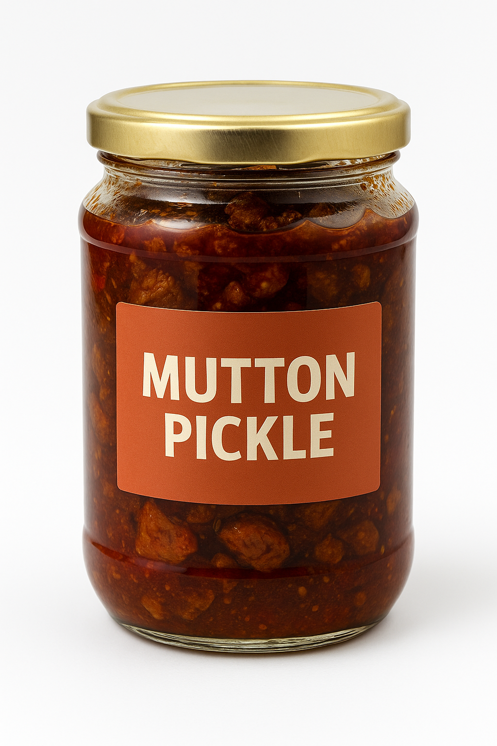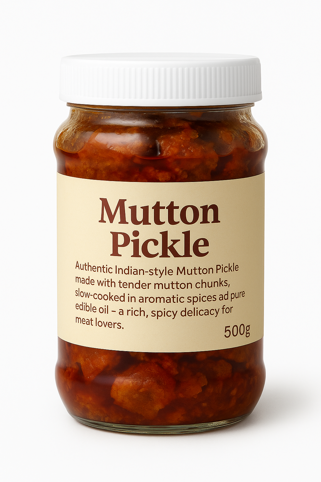 Indulge in the royal taste of our Traditional Mutton Pickle, crafted from juicy, boneless mutton pieces marinated in hand-ground spices and slow-cooked in pure oil for unmatched flavor. Each bite bursts with a perfect mix of heat, tang, and meaty richness — a true Andhra-style favorite. This pickle pairs wonderfully with steamed rice, parathas, or curd meals. Prepared using a time-honored recipe, it contains no artificial preservatives or colors — just pure, authentic homemade goodness.