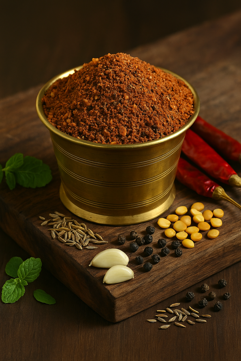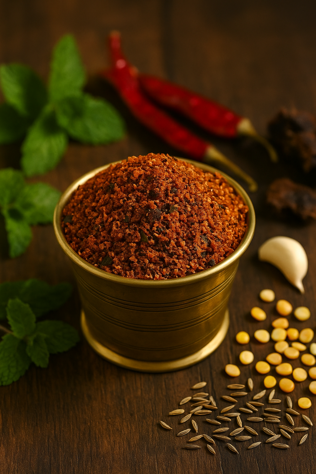 Mint (pudina) adds a naturally cooling, refreshing note, while the combination of chana dal, urad dal, and moong dal creates a rich, nutty base. Tamarind provides a tangy lift, cumin adds warmth, and garlic & black pepper enhance its bold flavor profile.